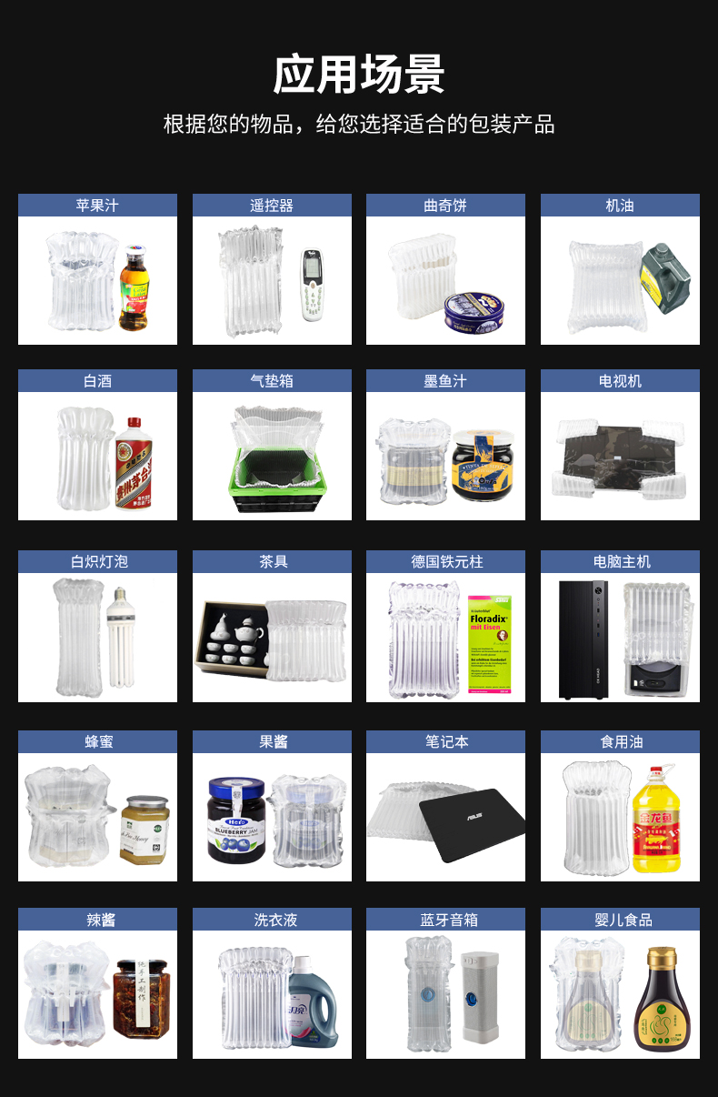 【产品介绍】: 该款属于定制款,能够根据纸箱大小定制,能够起到全面防护作用,适用于易碎品材质、玻璃、塑料、电子、陶瓷等产品领域,本产品需自行充气,只需充气不需封口,产品会自动封口。