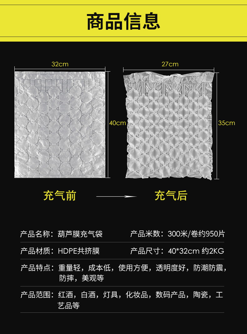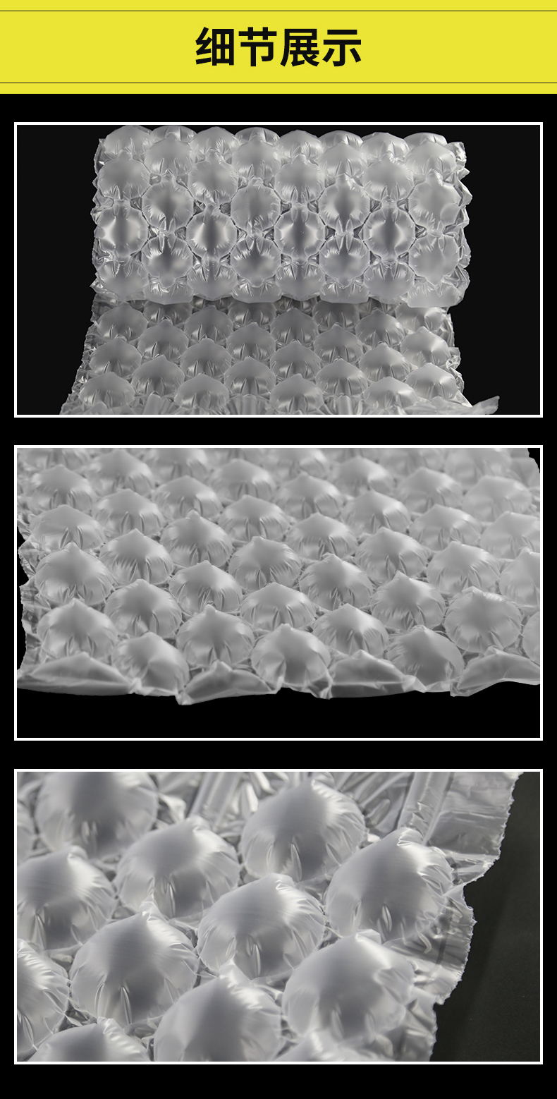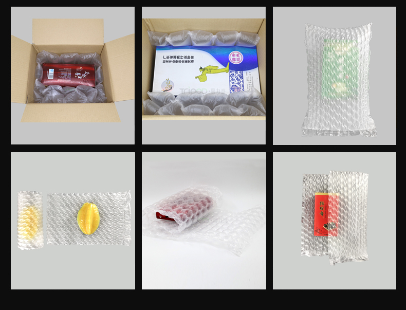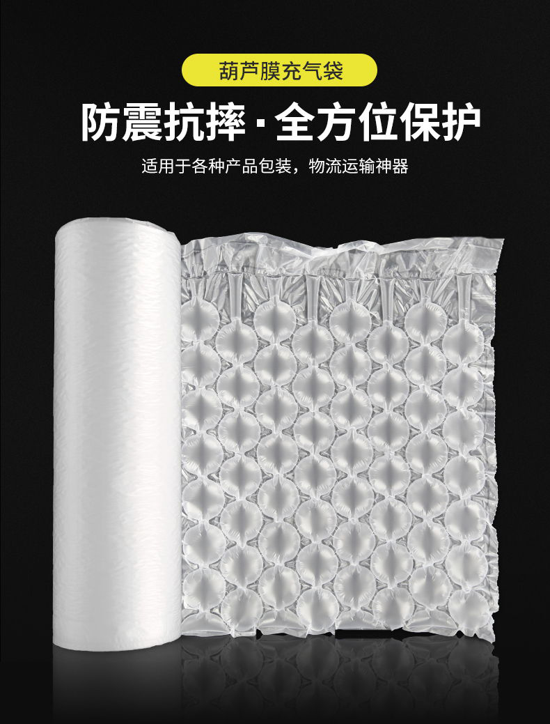 产品特性:葫芦膜用于产品货物运输的包装中,起到缓冲防震防摔作用,防止产品因颠簸、碰撞受到损害,充气前平整,节省大量的仓储空间和运输费用!