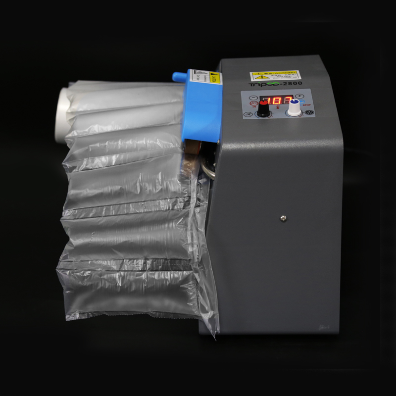 3.气泡枕的优点:在没充气时是一张薄薄A5纸,膜的厚度是2个丝,一卷膜4KG,长有600米约6000个气枕,充气机我们选用DS2800,这款是自动充气传送热熔封口锁气。充气后气体饱满,从易撕线这里撕开根据需求放入纸箱内使用。