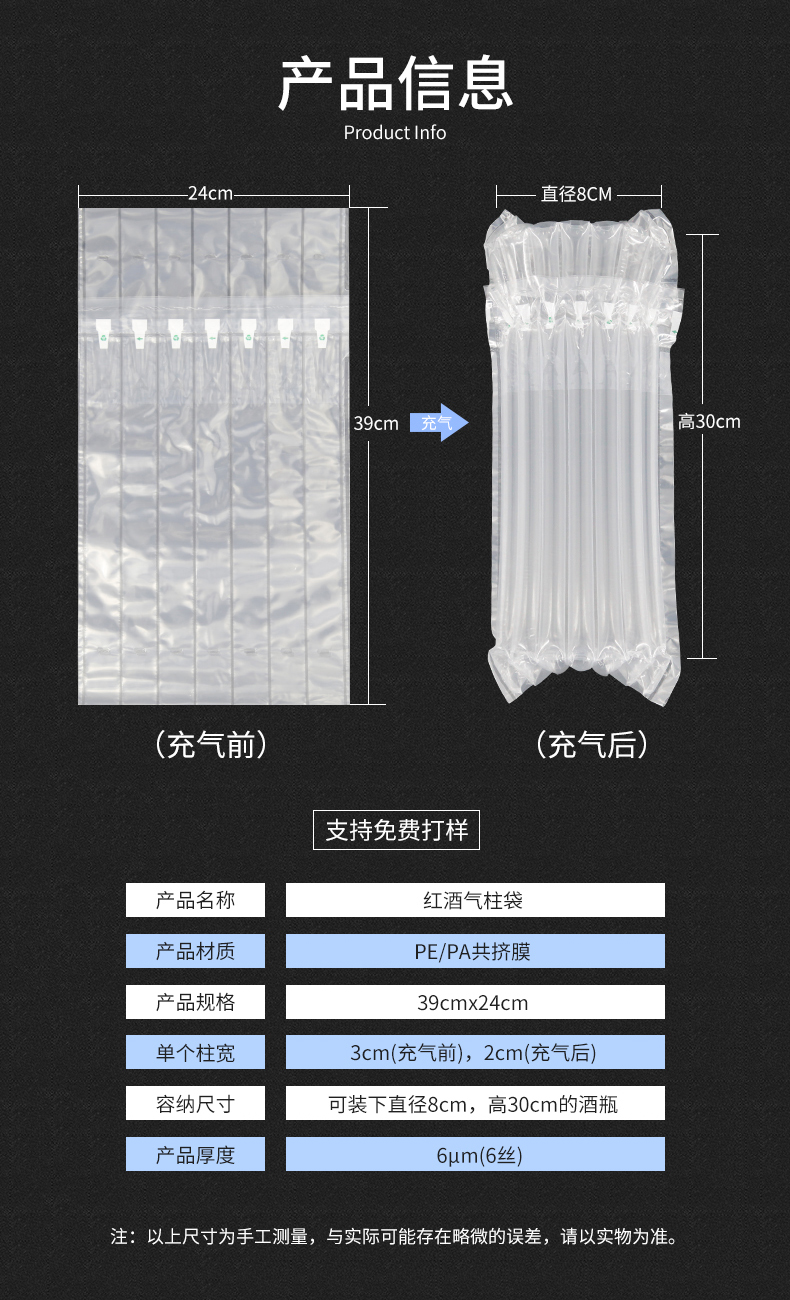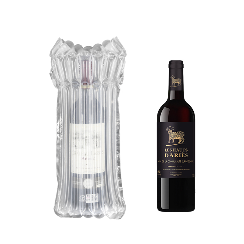 红酒使用气柱袋包装可以起到缓冲,抗挤压,防止摔碎的作用。
